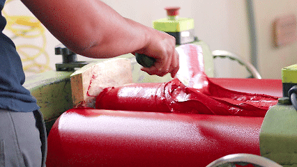Se introduce una placa cilíndrica en la suajadora para cortar de manera automática al cartón. Este proceso ofrece la posibilidad de crear proyectos de gran tamaño.